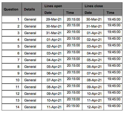 | Question | Lines open Date | Lines open Time | Lines close Date | Lines close Time |